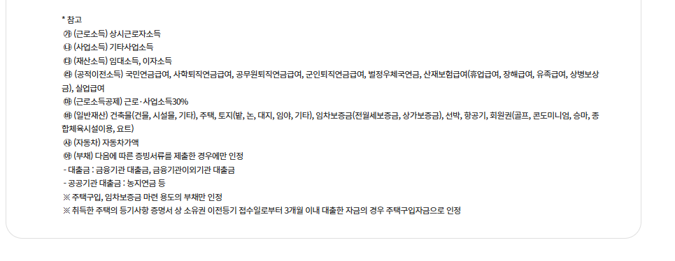 소득은 근로소득, 사업소득, 기타소득 등을 모두 포함해 산정되며 재산은 주택, 토지, 자동차, 금융자산 등을 종합적으로 평가합니다.